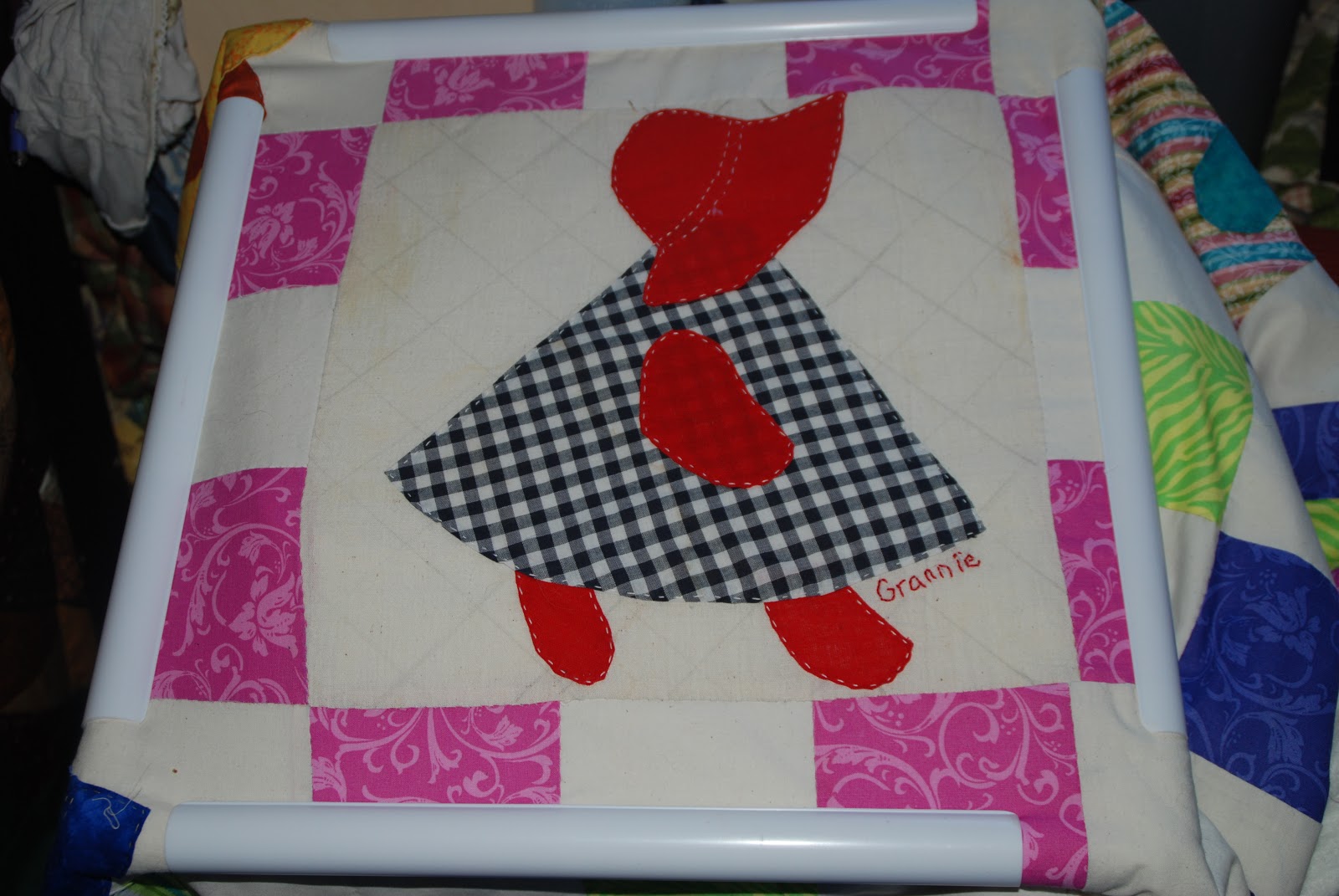 It's time to quilt another Sue quilt. I finally got this one for my 13 year old daughter ready to start on. This will be my carry with me project the next month or so. I want to have it finished by her birthday in February. The block here is one of the ones my Grannie made so many years ago. See I even put her name on that one. This quilt is also my first hand piecing project. I did the whole top by hand. I did break down and put the back together on the machine though.