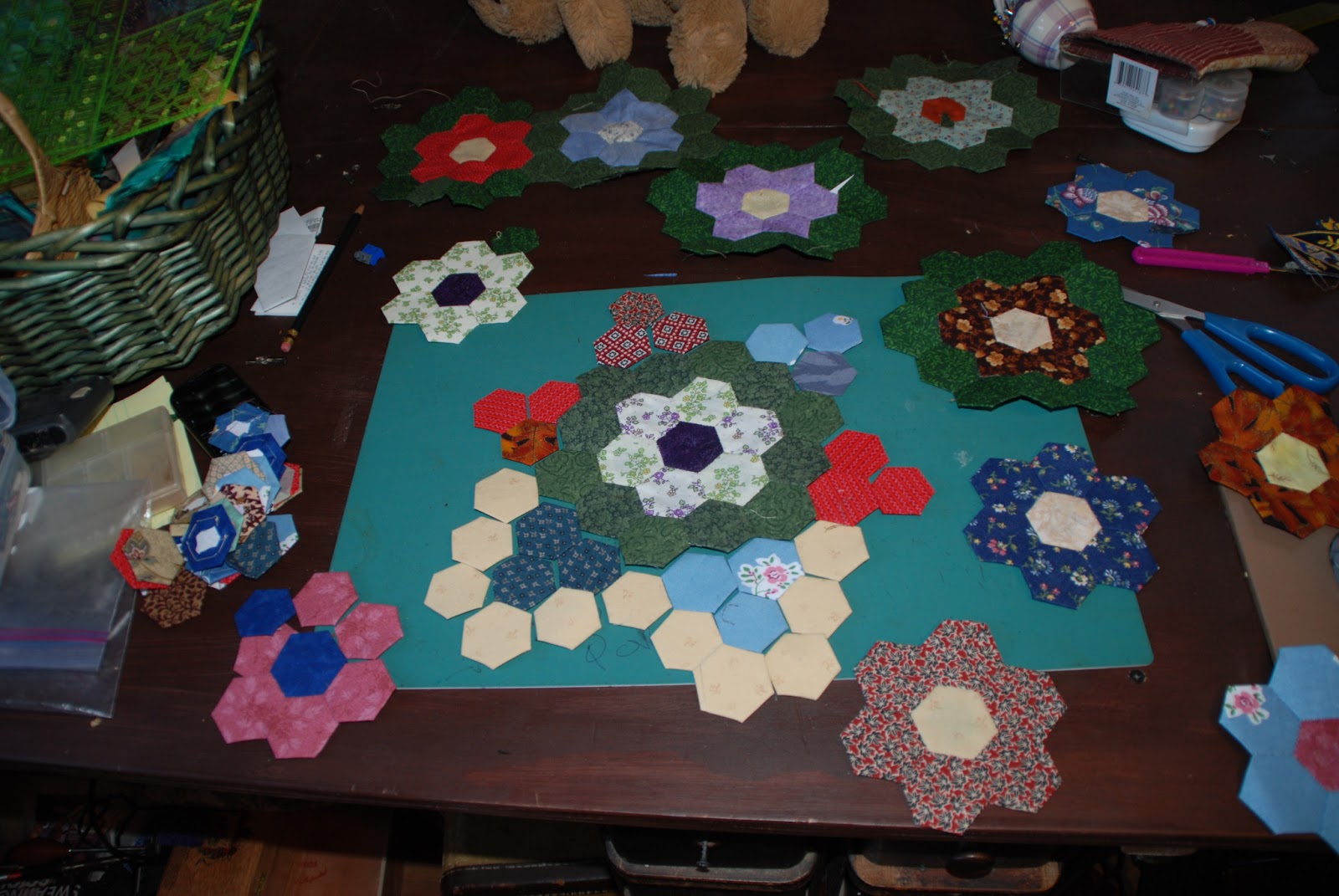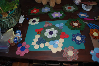 I've finally decided on a pattern for the hexies. I saw a quilt similar to this online and loved it. So here's what mine will look like eventually....